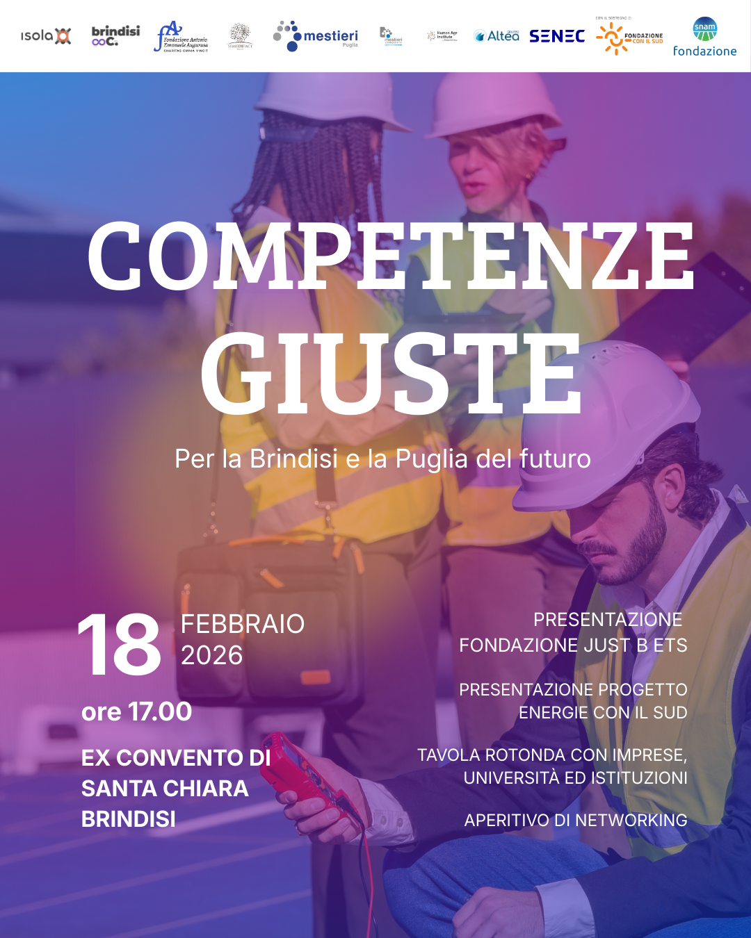 A Brindisi, Energie con il Sud si inserisce nel lavoro che la Fondazione Just B ETS (già Brindisi & C. ETS) porterà avanti per rafforzare Brindisi come luogo di competenze specialistiche e lavoro dignitoso e ambizioso nella transizione ecologica, creando condizioni concrete per chi sceglie di restare, tornare e investire il proprio futuro qui, Segue una precedente esperienza, la Green Skills Academy, sostenuta sempre da Fondazione Snam, che ha già previsto l’inserimento lavorativo di alcuni studenti.