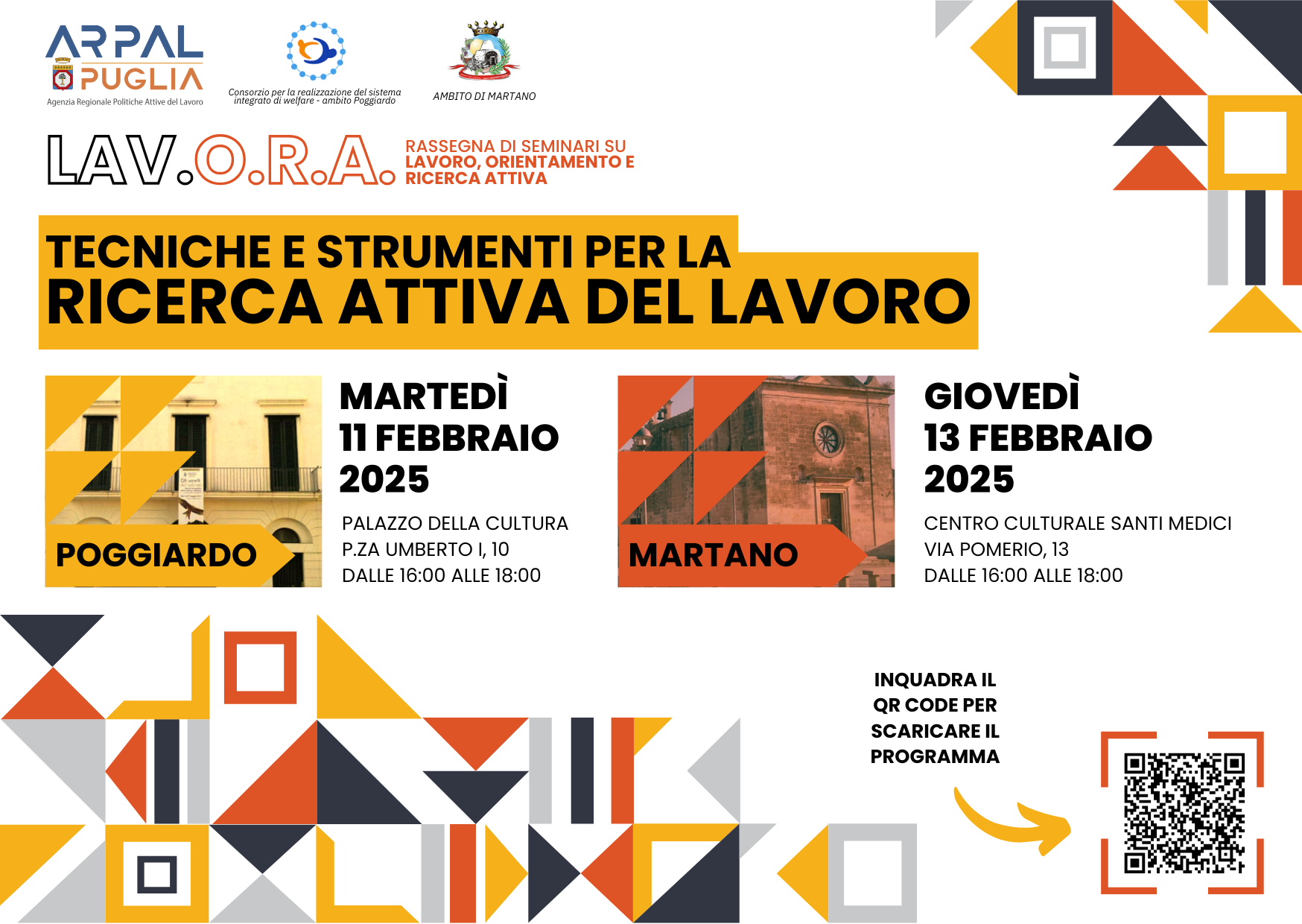 Il primo si terrà martedì 11 febbraio, dalle ore 16 alle ore 18, presso il Palazzo della Cultura di Poggiardo. Il secondo, nella stessa fascia oraria, è in programma giovedì 13 febbraio presso il Centro culturale Santi Medici a Martano. Qui è possibile scaricare il programma completo: https://sintesi.regione.puglia.it/web/sintesi-lecce/-/-lav-o-r-a-al-via-i-seminari-arpal-su-lavoro-orientamento-e-ricerca-attiva