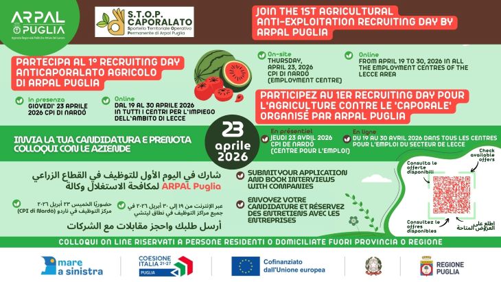 ARPAL Puglia sperimenta nel Salento il primo Recruiting Day per contrastare il caporalato agricolo. Sedici aziende in cerca di personale per la stagione della piantumazione, raccolta e trasformazione di prodotti agricoli svolgeranno selezioni in presenza, presso il Centro per l’Impiego di Nardò, in provincia di Lecce, nel pomeriggio di giovedì 23 aprile (h 15-17). Oltre ai colloqui diretti, però, si terranno sessioni online, mirate ad intercettare lavoratrici e lavoratori domiciliati o residenti fuori provincia o fuori regione, in coerenza con la Strategia regionale #mareAsinistra della Regione Puglia: i colloqui da remoto si terranno in tutti i Centri per l’Impiego dal 19 al 30 aprile, previa prenotazione al seguente link:  https://forms.gle/kE1SRNL2RBBqnQnJ8.