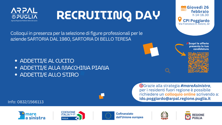 Giovedì 26 febbraio 2026, il Centro per l’Impiego di Poggiardo ospiterà il Recruiting Day organizzato da Arpal Puglia. L’appuntamento è presso gli uffici di via Francesco A. Astore 32, dalle ore 14:00 alle ore 16:30.