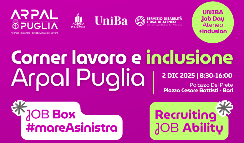 Per ulteriori dettagli e per il programma completo: https://sites.google.com/arpal.regione.puglia.it/corner-jobdays-uniba-inclusion/home