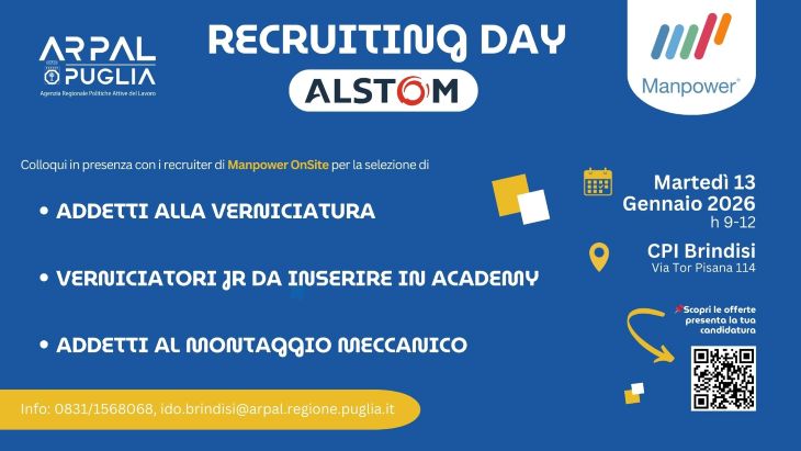 Martedì 13 gennaio, dalle 9:00 alle 12:00, presso il Centro per l’Impiego di Brindisi (via Tor Pisana 114) avrà luogo il Recruiting Day organizzato da ARPAL Puglia e Manpower srl, per conto di Alstom SPA.